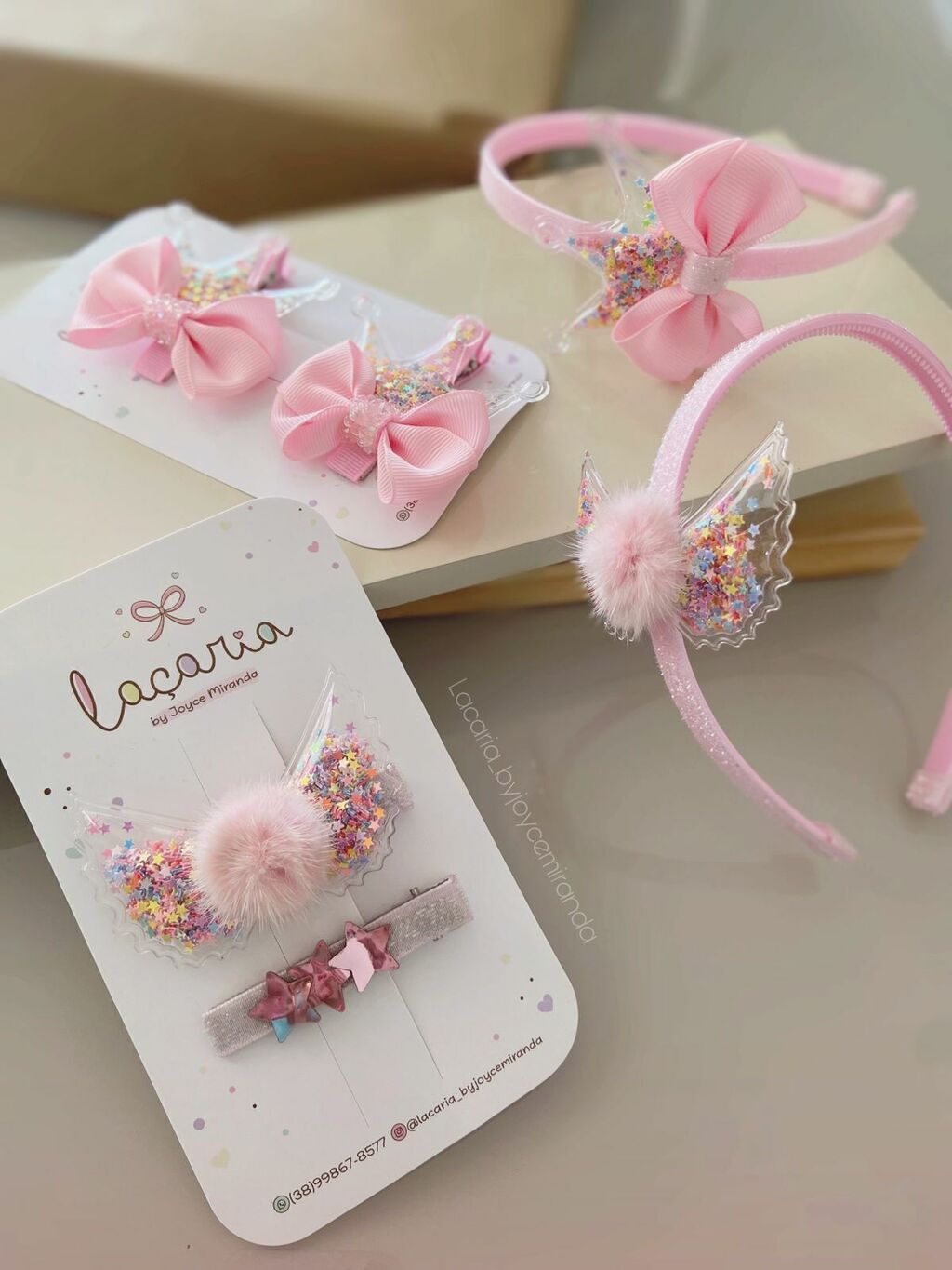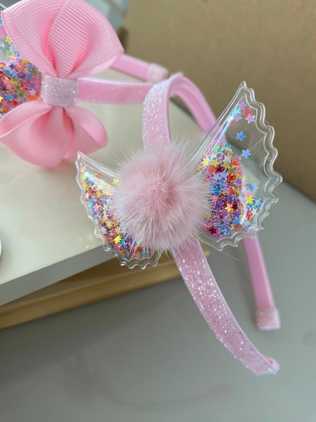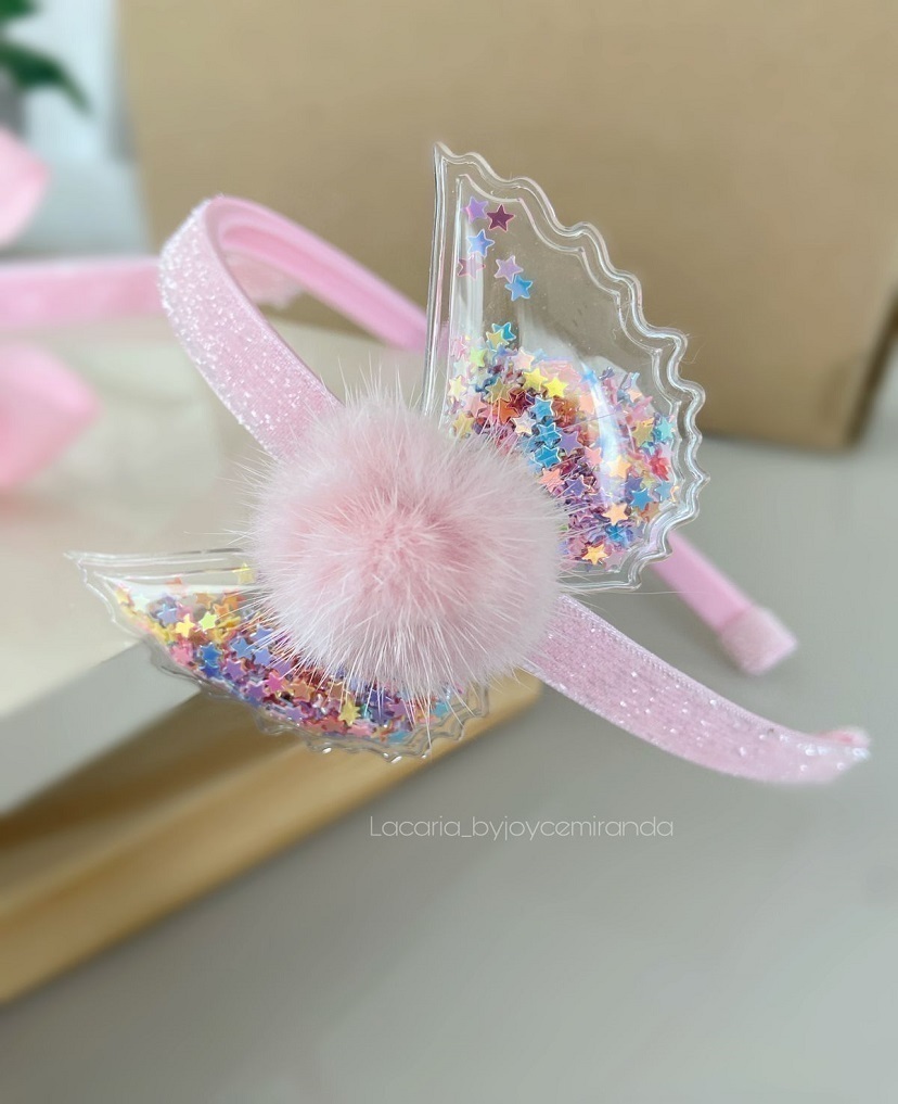 Asinha de anjo transparente com confetes de estrelinhas coloridas e pompom pelinho rosa.