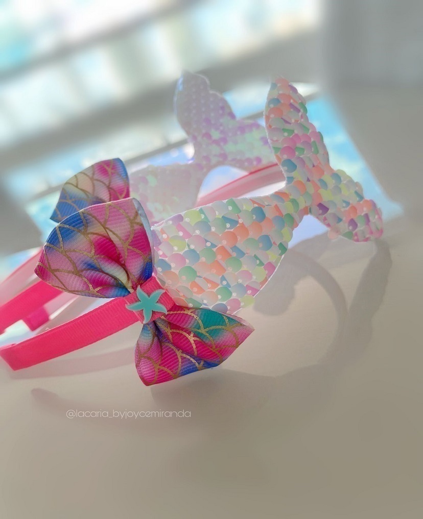 Calda de sereia em paetês e detalhe com lacinho com estampa de sereia.