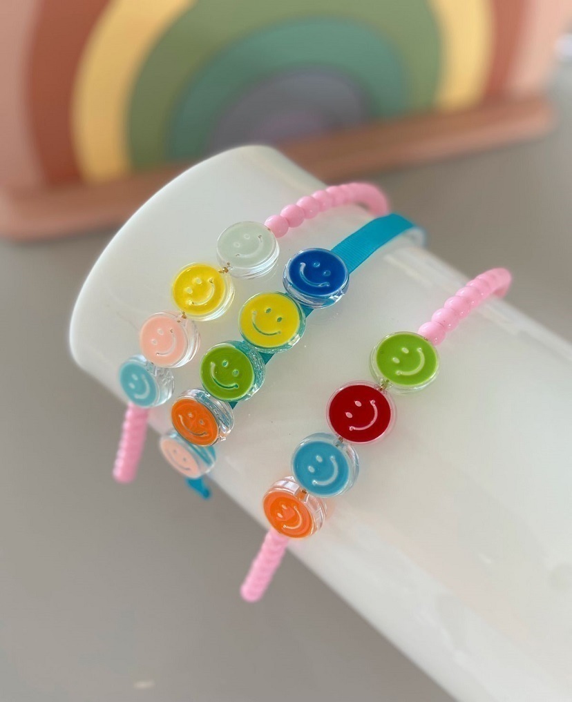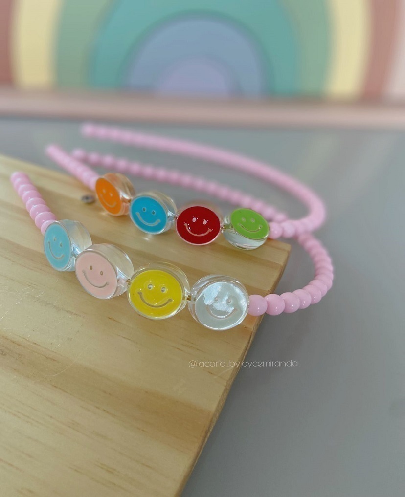 Arco com contas rosa e detalhe do aplique smile.