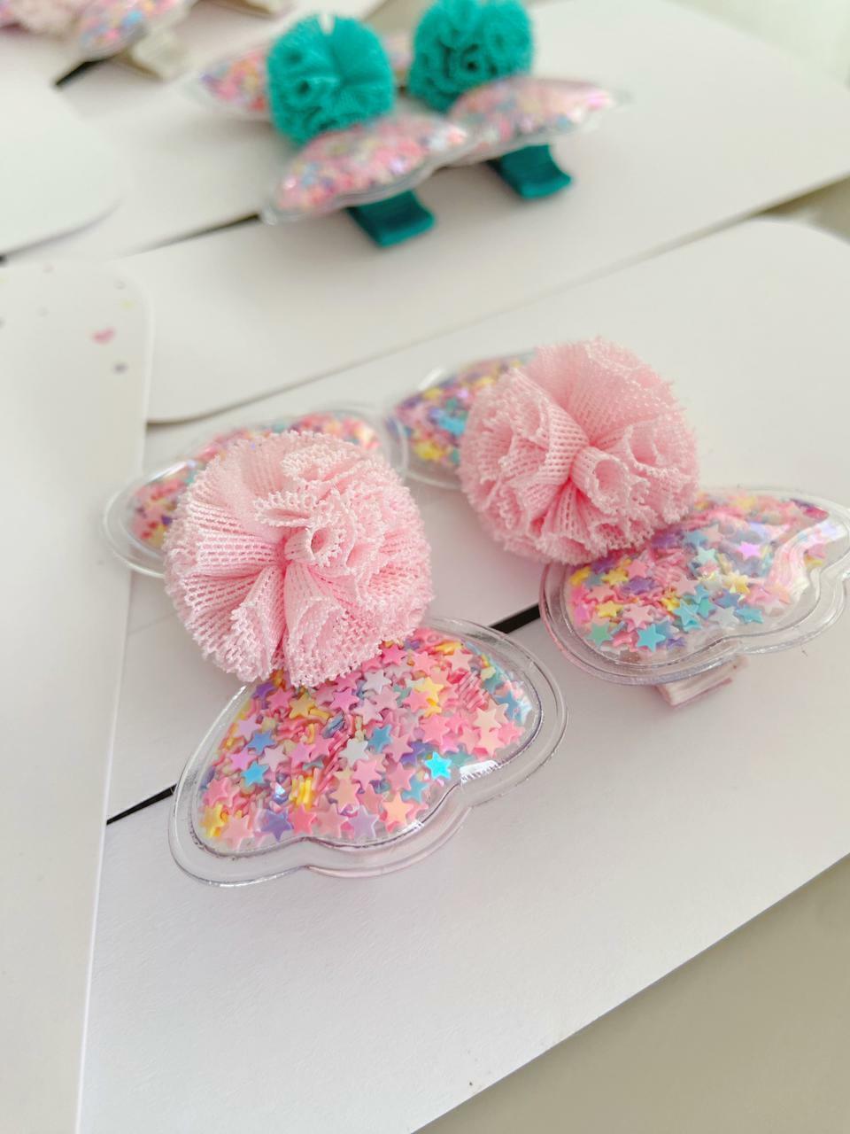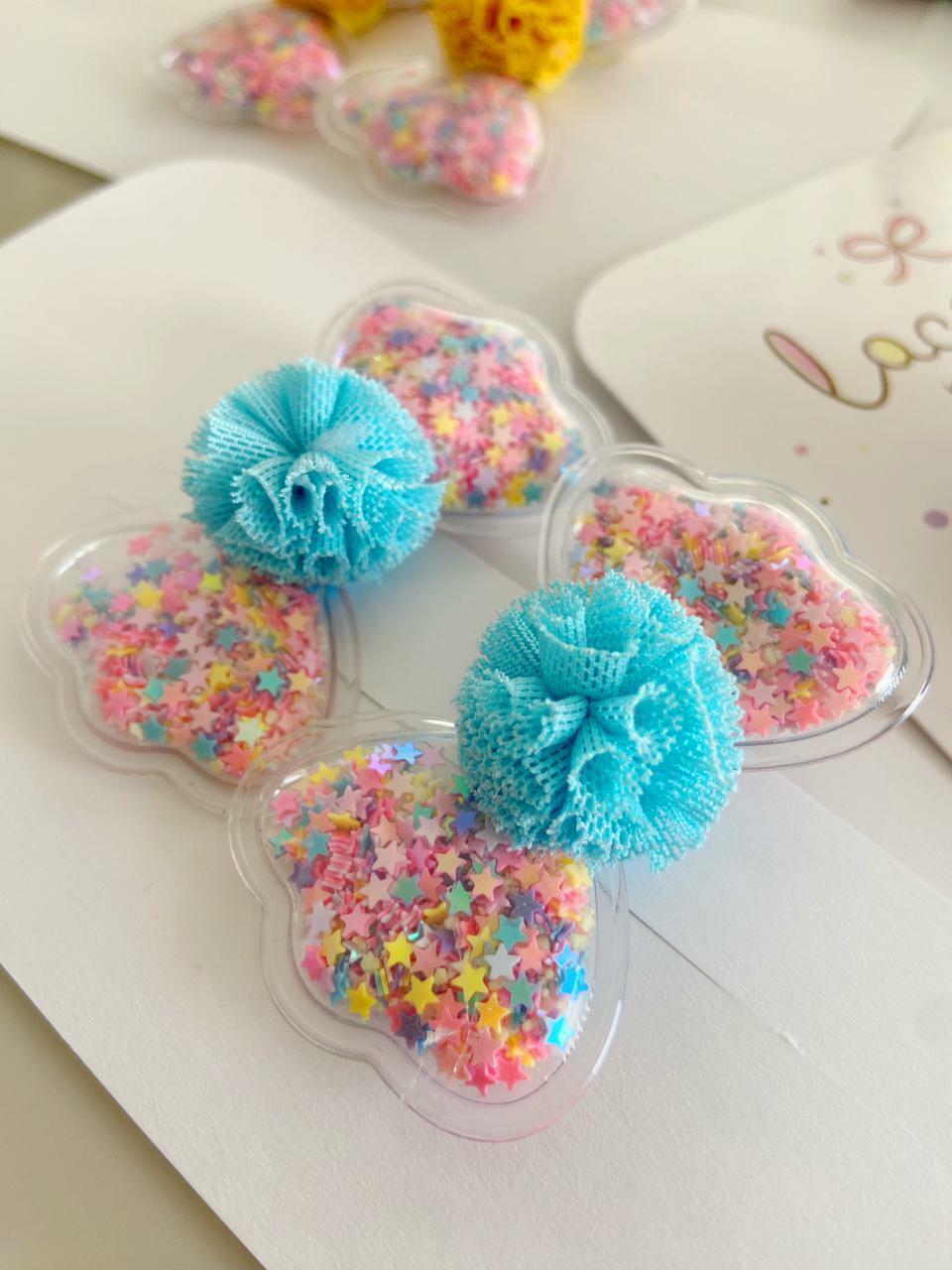 Laço Transparente com confetes de estrelinhas e aplique de pompom.