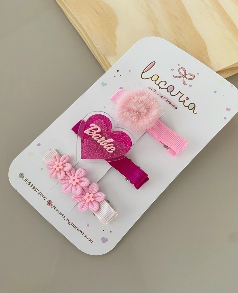 Trio hair clips Barbiecoração acrílico