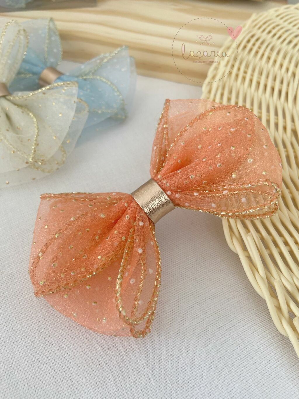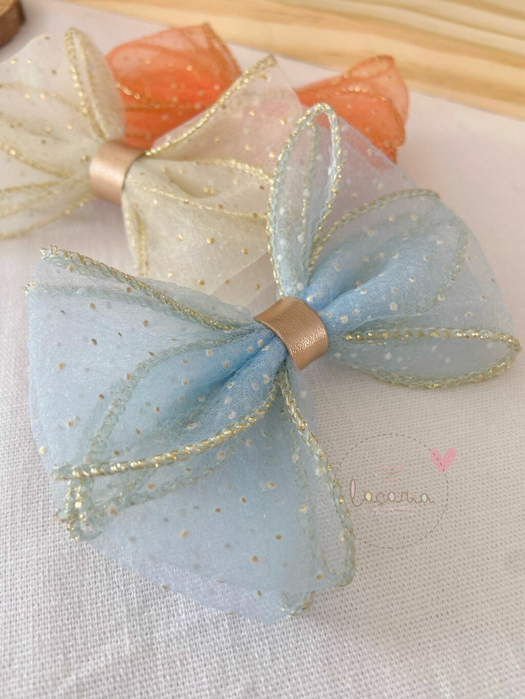 3- Laços médio em organza. Detalhes em fios e poás dourado.