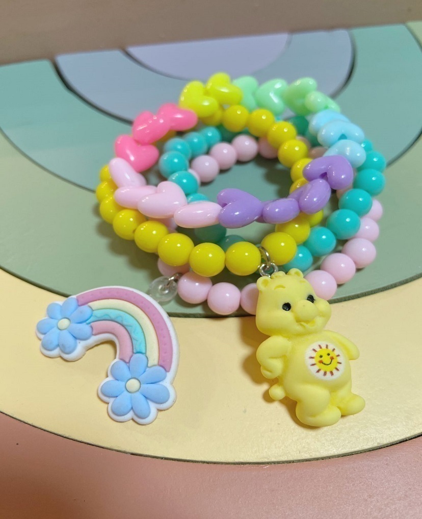 Personagem do ursinho em resina e arco iris emborrachado.
