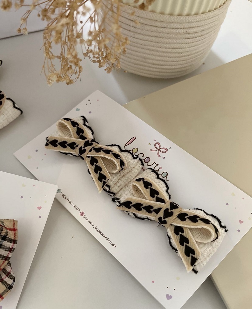 Laço Helena duplo tweed, sobreposto laço de corações.